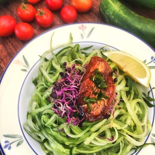 Poi ho farcito le “tagliatelle vegetali” con i germogli di rapanello (la germogliatrice ancora non ce l’ho) trovati al supermercato e per finire ho aggiunto un pomodorino secco reidratato.