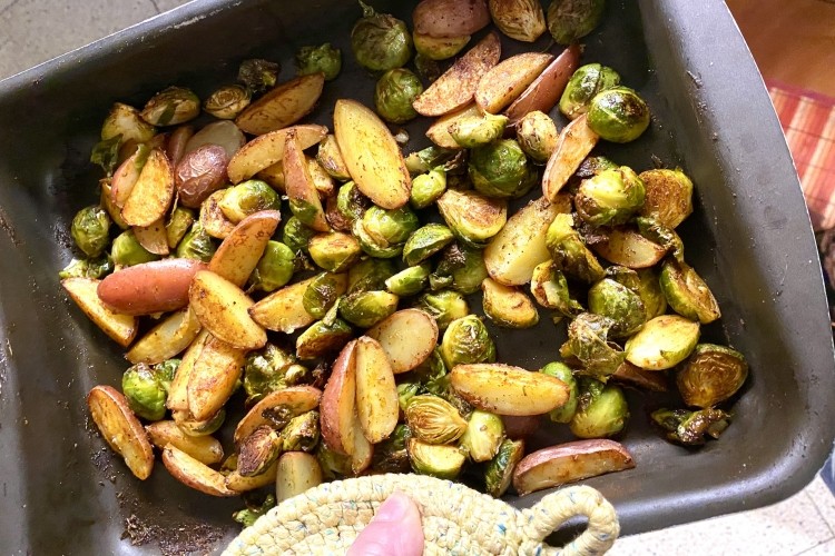 Dopo aver tagliato le verdure a metà e averle messe in una teglia da forno con un filo d’olio d’oliva io cospargo cavolini e patate cn un po’ di paprica ed erbe aromatiche rigirandole, per insaporirle bene, con le mani.