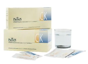 1 bustina di CK Promin in mezzo bicchiere d’acqua alla mattina.