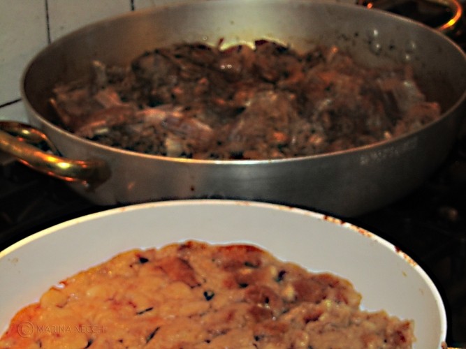 Una volta pronte, abbiamo unito le patate e con l’aiuto di un po’ di acqua abbiamo aspettato che si ammorbidissero per poi spezzarle con un cucchiaio di legno, Stefano sosteneva infatti fosse questo un passaggio fondamentale per la preparazione.